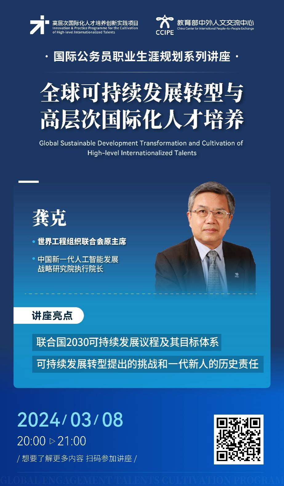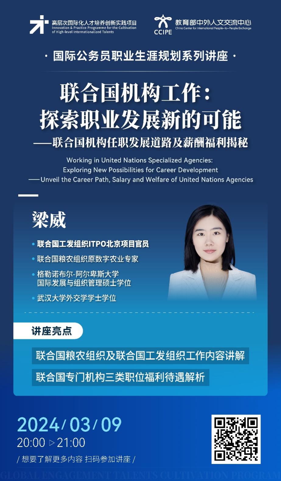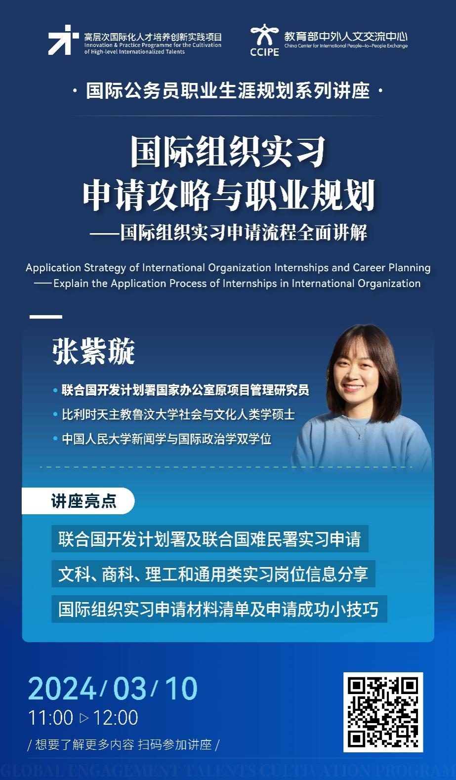 为进一步开拓学生全球视野和提升跨文化沟通能力,明晰未来职业发展方向,2024 年春季学期国际公务员职业生涯规划讲座将于 3 月 8 日开启,现就相关事宜通知如下: