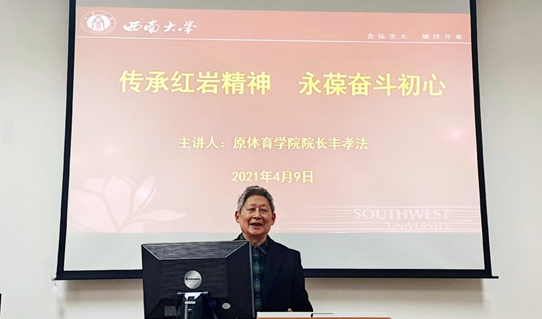 本次活动第二讲由原体育学院院长丰孝法教授讲授,丰教授首先为大家介绍了西南大学发展史,体育学院发展史。他讲到,在党的依托下,所有西大人齐心协力,共创辉煌历史,学校始终以国家富强和民族振兴为己任,杏坛育人,劝课农桑,积淀了深厚的人文底蕴,一大批名师先贤曾执教于此,春风化雨,躬耕不辍,数十万毕业生从这里走向四面八方,成为民族复兴大业的建设者和各行各业的中坚骨干。回首过去,体育学院在人才培养、科学研究、社会服务等方面取得了突出成绩。这一切的辉煌成就离不开党的支持,在未来我们要以中国梦为指引,为实现中国梦增砖添瓦。