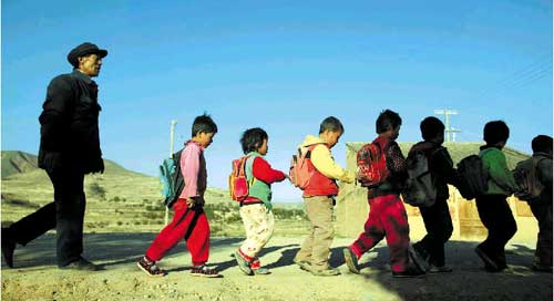甘肃省渭源县王政明老师教出了76个大学生,村里三代都是他的学生,每天,他都护送小学生回家(王轶庶/图)代课教师艰辛执著震动人心