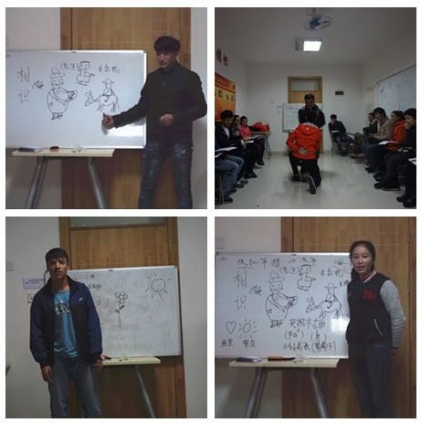 课堂主要包括欢乐相识、学习经验分享、礼品及作业安排三个部分。在第一个环节中沙影老师通过做游戏的形式调动同学们的积极性,使大家在轻松愉悦的氛围中勇敢的走向讲台,通过舞蹈、唱歌、绘画等自己特有的方式介绍自己。帕尔哈提.买明在经验交流中说到曾连续两年每天学习到凌晨三点的刻苦经历时,在场的每位学生无不敬佩,“我们少数民族学生,不仅要认真学好专业课,在保证不挂科的前提下,还应积极参加各类文体活动,按照优秀少数民族的标准,严格要求自己,我们普通话水平较汉族同学差的多,我们要比别人花更多的精力放在学习上,只有这样在最后的简历上才能够多写几笔,才能找份好工作”帕尔哈提.买明由衷的说到。22名同学纷纷表示希望像帕尔哈提.买明一样,可以做一名全面发展的优秀少数民族学生。随后,沙老师为每位学生发放了练字帖、钢笔及墨水,鼓励大家坚持练字,多与汉族同学交流,充分利用现有的语言环境,为更好的适应社会做准备。